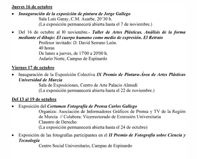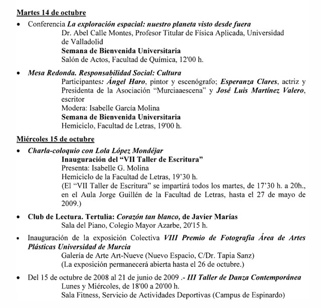 Murcia Noticias Actividades culturales de la Universidad de Murcia para la semana del 13 al 19 de octubre 10/10/2008 Actividades culturales de la Universidad de Murcia para la semana del 13 al 19 de octubre Fuente: Universidad de Murcia