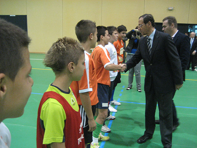 Tras el protocolario corte de la cinta que simboliza la inauguración de la instalación y las palabras dirigidas a los asistentes por el Alcalde, Miguel Ángel Cámara, el protagonismo del acto ha pasado al equipo infantil federado de fútbol-sala de Javalí Nuevo, quienes han celebrado un partido con el que se ha utilizado por primera vez el pabellón.