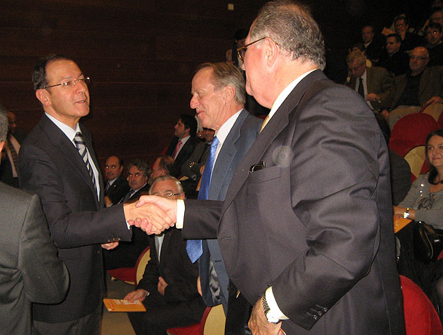 Foto 2: el Alcalde, saludando a los dos ponentes de las jornadas. En primer término (con gafas), Martín Bassols y, al lado (corbata azul), Tomás Ramón.