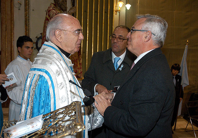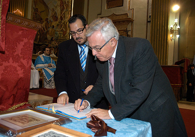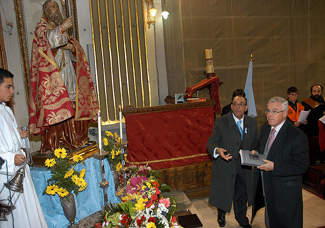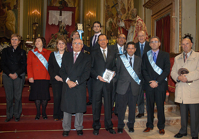 Una vez en el templo se procedió al acto de entrega de ofrendas al santo y al nombramiento de fiel contraste de honor, que ha recaído en el alcalde de Murcia, Miguel Ángel Cámara, y de estante de honor, en la persona del periodista Antonio Botías.