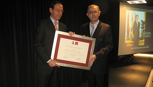 El Alcalde, Miguel Ángel Cámara, ha recibido hoy la distinción como Personalidad del Año para la Profesión que le ha concedido el Colegio Oficial de Aparejadores y Arquitectos Técnicos de la Región de Murcia en un acto celebrado en la sede de esta institución.