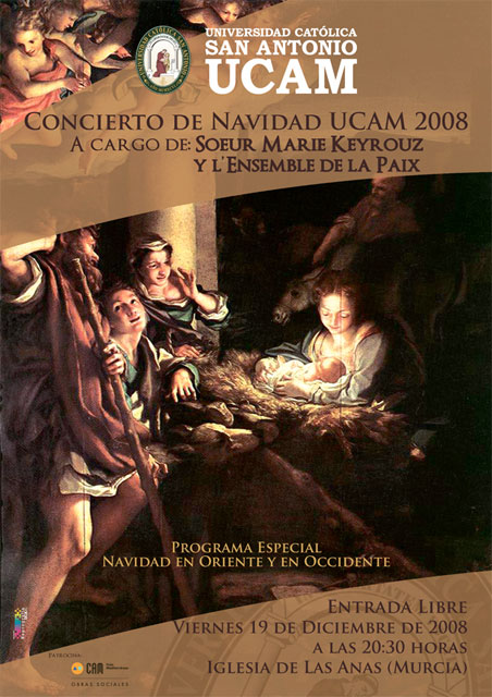 La UCAM ofrecerá el próximo viernes 19 de diciembre, a las 20:30 horas, en la Iglesia de las Anas, su tradicional concierto de Navidad. El evento musical correrá a cargo de Soeru Marie Keyrouz y el grupo L´Ensemble de la Pax, formación integrada por músicos de todos los países y todas las religiones del Próximo y Medio Oriente, unidos por el deseo común de interpretar música espiritual. La prestigiosa formación musical, ofrecerá bajo el título “Navidad en Oriente y Occidente”, un atractivo repertorio compuesto por sugerentes piezas de música sacra orientales y occidentales, como el O Sanctissima de Beethoven, al Ave María de César Franck, Jusqu´à quand, de Joseph Mouannes, Touba Nahum o el villancico Adeste Fideles, entre otras.