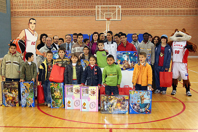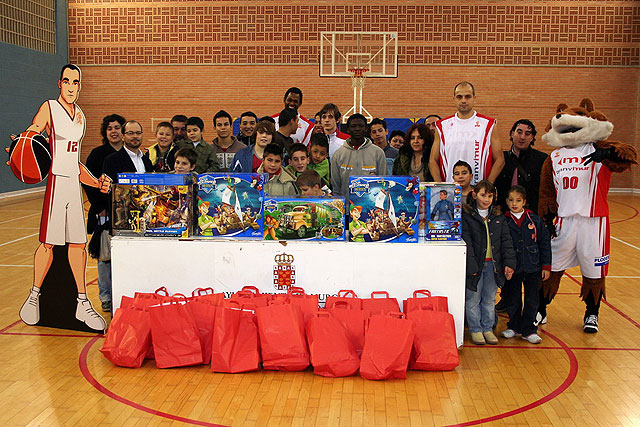 El pívot Lamont Barnes, el base murciano José Antonio Marco Gaona y el capitán del equipo, Óscar García, han querido participar entregando personalmente los regalos a los menores, además de invitarles a presenciar el choque frente al CAI Zaragoza, que finalmente se ha saldado con una importante victoria murciana por 91 a 82.