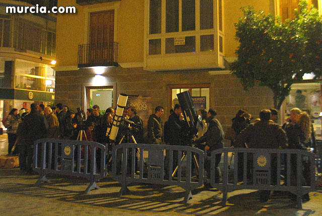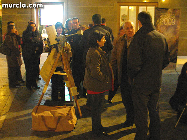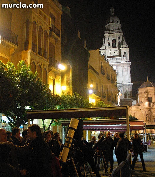 Numerosos vecinos pudieron contemplar anocheel firmamento gracias a los telescopios que la Agrupación Astronómica de Murcia instaló en la plaza de Belluga de Murcia.