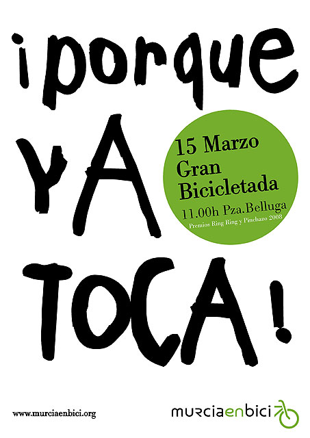 La asociación Murcia en Bici convoca para el próximo día 15 de marzo, domingo, una GRAN BICICLETADA que partirá de la Plaza Belluga a partir de las 11 de la mañana. Se hará un recorrido por las principales vías de la ciudad para concentrarnos de nuevo en el punto de partida y llevar a cabo distintas actividades lúdicas y reivindicativas como:
