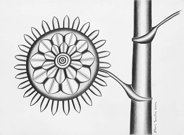 La exhibición, comisariada por David Pérez, muestra dibujos a lápiz que “sugieren formas vegetales a través de líneas, son flores y tallos pertenecientes a un jardín imaginario en blanco y negro y geométrico que en algunas partes se observa como a través de zoom”, según explicó Martínez.
