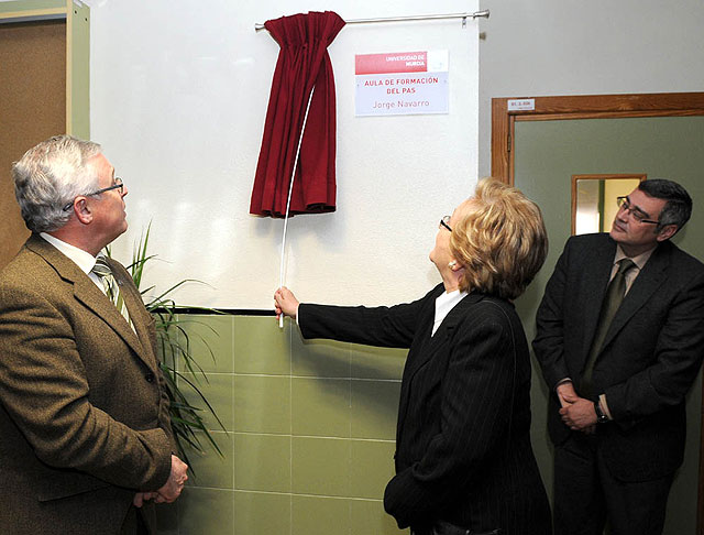 La Universidad de Murcia ha rendido un homenaje póstumo al que fue su gerente, Jorge Navarro, con la colocación de una placa que da su nombre a un aula de formación del personal de administración y servicios ubicada en el Aulario “Giner de los Ríos”, en el campus de Espinardo.
