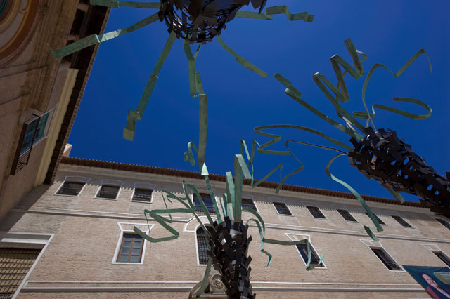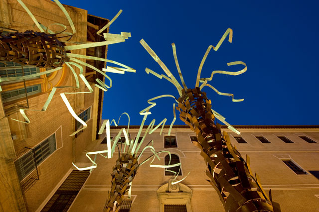 Así como las palmeras de nuestros cuadros se crean para ser contempladas desde la distancia, estas esculturas están diseñadas para tener que pasar por debajo de ellas, contemplarlas desde abajo, sentir las y fundamental mente que establezcan un discurso con el entorno con el que se encuentran. Por ello la disposición, al salir de la arcada del martillo, prolonga el recorrido de la avenida de la glorieta, hasta que llegas a ellas y rompemos el eje con un quiebre, marcado por la luz en el suelo que te obliga a sentirlas.