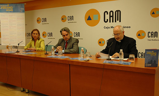 El vicerrector de Extensión Universitaria de la UCAM, Antonio Alcaraz, junto con la rectora de la Universidad, Josefina García y el presidente territorial de Caja Mediterráneo, Ángel Martínez, presentó esta mañana en el Aula de Cultura de la CAM, el programa de ocio, actividades formativas, culturales, deportivas y de voluntariado, correspondiente a la edición 2009 de la Universidad de Verano, que se desarrollará durante los meses de julio, agosto y septiembre en una treintena de sedes dentro y fuera de España.