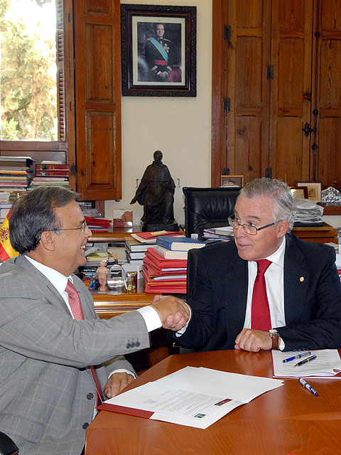 El rector, José Antonio Cobacho, y el director general de Estrella de Levante, Patricio Valverde, firmaron el acuerdo de patrocinio, en un acto que se desarrolló en el edificio de Convalecencia.