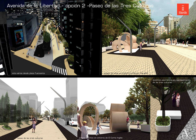 - Opción 2 (PASEO DE LAS TRES CULTURAS). Se juega con el simbolismo de las tres culturas (judía, árabe, cristiana), mediante la reserva de tres espacios vegetales con cipreses, olivos y palmeras. La pavimentación, entrelazada a lo largo de todo el perímetro, también será otro elemento que simbolizará la unión de las tres culturas en Murcia.