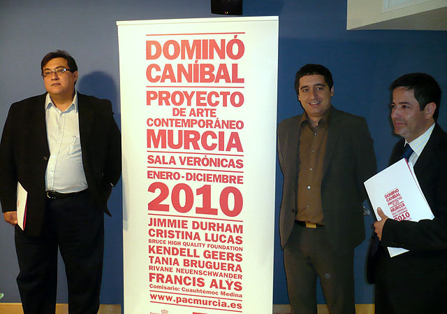 El consejero de Cultura y Turismo, Pedro Alberto Cruz, presentó hoy el PAC Murcia 2010 (Proyecto Arte Contemporáneo), junto a su comisario, Cuauhtémoc Medina, que, bajo el título ‘Dominó caníbal’, supone un nuevo formato de exposición en el que habrá una sola sede, la Sala de Exposiciones de Verónicas, y en el que, por un periodo de 12 meses los artistas tendrán que partir de la obra realizada por el anterior para crear la suya propia.