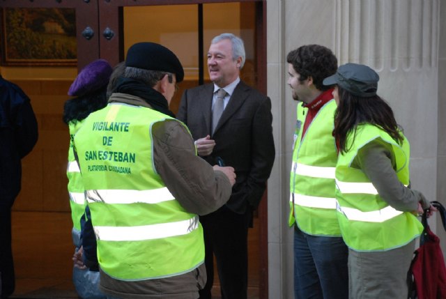 Los miembros de la Plataforma ciudadana, que se concentraban frente al Palacio de San Esteban antes del inicio de la reunión del Comité de Expertos, han conversado durante varios minutos con el Presidente Valcárcel, en la puerta del Palacio, sobre sus inquietudes y la reivindicación de que se inicie el expediente de Bien de Interés Cultural, para lo que han recogido más de 4.000 firmas.