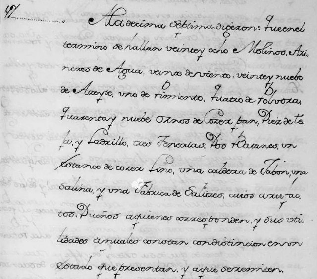 El texto dice lo siguiente: “A la décima séptima dijeron: Que en el término (de Murcia) se hallan veinte y ocho Molino Harineros de Agua, veinte de viento, veinte y nueve de aceite, uno de pimiento, cuatro de pólvora, cuarenta y nueve hornos de cocer pan, diez de teja y ladrillo, tres frenerías, dos batanes, un estanco de cocer lino, una caldera de jabón, una salina y una fábrica de salitres…”.