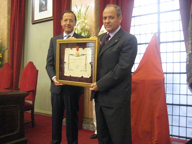 El Alcalde de Murcia, Miguel Ángel Cámara, ha hecho entrega de la distinción al presidente del Cabildo Superior de Cofradías, Antonio Ayuso, en un acto que ha contado con la presencia de miembros de la Corporación Municipal y representantes de las diferentes cofradías y agrupaciones festeras del municipio.