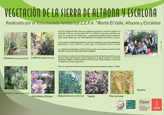 Este póster, titulado “Vegetación de la Sierra de Altaona y Escalona”, recoge una descripción de los valores ambientales presentes en este espacio protegido, describiendo mediante fotografías las especies botánicas más características de la zona, como el palmito, el enebro, el lentisco o la jara blanca, entre otras, que han sido catalogadas mediante un censo de vegetación por los participantes en el Programa de Voluntariado desarrollado por la Concejalía de Medio Ambiente.