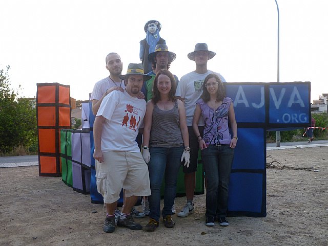 El montaje, de 5 metros de altura, y que combina la quema con un espectáculo pirotécnico y de fuego dirigido, está dirigido por el estudiante de Bellas Artes Miguel Gálvez, vecino de Aljucer, y en el mismo han colaborado un equipo de 8 voluntarios para su realización.