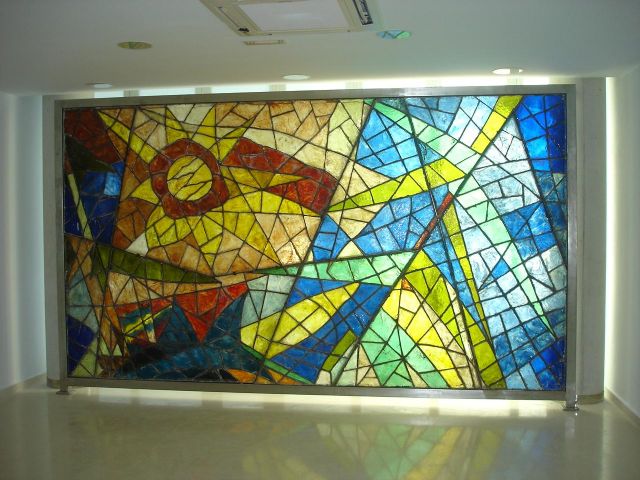 Las vidrieras son de estilo abstracto y simbolizaban, junto a la parte del mural desaparecida, las cañas del río Segura. En su día, la propietaria del edificio –Cruz Roja-- se propuso vender la pieza en una subasta benéfica. Muñoz Barberán declararía entonces que se mostraba satisfecho por la deferencia de salvarla.