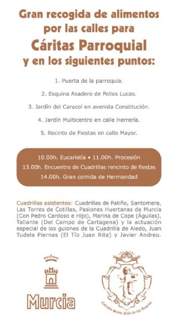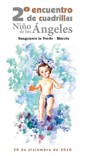 La Cofradía del Santo Niño de los Ángeles, de Sangonera la Verde, en colaboración con Cáritas parroquial ha organizado para el próximo domingo, día 26 de diciembre, el II Encuentro de Cuadrillas Niño de los Ángeles, que reunirá en la pedanía a las Cuadrillas de Patiño, Santomera, Las Torres de Cotillas, Pasiones Huertanas de Murcia, Marina de Cope (Águilas), Tallante (Del Campo de Cartagena) y contará con la actuación especial de los guiones de la Cuadrilla de Aledo, Juan Tudela Piernas (El Tío Juan Rita) y Javier Andreu.