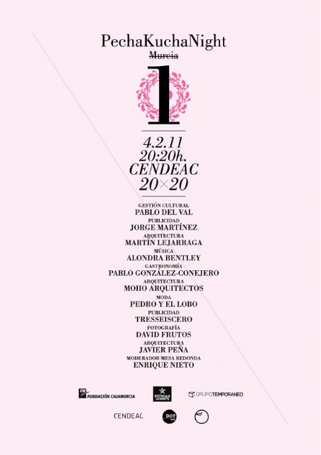 En este primer volumen de Pecha Kucha Night en la ciudad de Murcia tendremos la oportunidad de contar con ponentes de de muy diversa índole, venidos desde la arquitectura, la fotografía, el arte, la moda, la publicidad o la gastronomía. Algunos de los participantes que estrenarán la edición son la cantante Alondra Bentley, el nuevo director de la Conservera Pablo del Val, el arquitecto Javier Peña director de Xpiral, los jóvenes publicistas Tresseiscero, el cocinero Pablo González-Conejero, el fotógrafo David Frutos, el diseñador Pedro y El Lobo, los jóvenes arquitectos Moho Arquitectos, el publicista cabeza de Germinal Jorge Martínez, y el arquitecto Martín Lejarraga. En este Volumen se ha introducido la figura de moderador de Speakers que seráel arquitecto y profesor Enrique Nieto. El evento ha sido comisariado por DOT Agency for Architectural Affairs.La celebración tendrá lugar en el CENDEAC [Centro de Documentación y Estudios Avanzados de Arte Contemporáneo] el próximo viernes 4 de Febrero a las 20.20h.