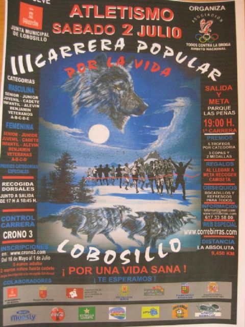 Lobosillo celebra el sábado, día 2 de julio, la III Carrera por la Vida con el objetivo de fomentar el deporte entre personas de todas las edades y luchar contra la droga. Esta carrera reunirá a más de 800 atletas de todas las categorías, que recorrerán las principales calles del pueblo con una distancia absoluta de 9,450 kilómetros.