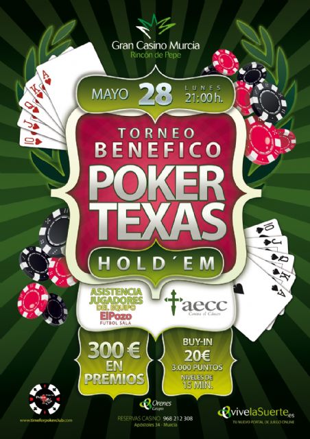 ElPozo Murcia FS colabora con el Casino de Murcia Rincón de Pepe en el Torneo Benéfico de Poker Texas que organiza hoy a partir de las 21.00 horas a favor de la Asociación Española contra el Cáncer al que asistirán los jugadores del conjunto murciano; Miguelín, Adri y Bebe y Álex para apoyar la iniciativa.