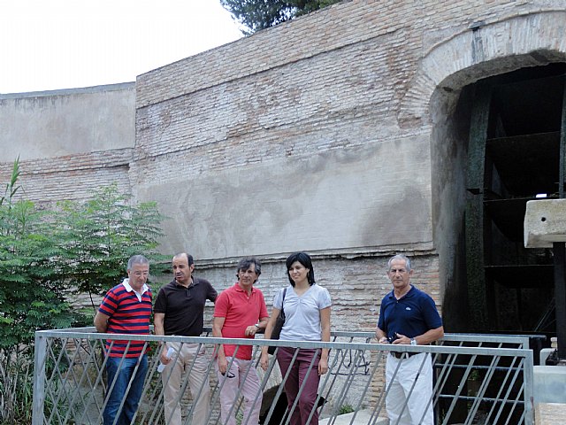El portavoz del Grupo Socialista, Pedro López, acompañado por los ediles Juan Patricio Castro y Andrea Garries; y el vocal del PSOE en la Junta Municipal de La Ñora y el anterior edil socialista Joaquín Ródenas y Sebastián Peñaranda, respectivamente, han visitado hoy la Rueda de La Ñora para comprobar su estado y exigir al PP de La Glorieta que escuche las recomendaciones de la Dirección General de Bellas Artes en cuanto a la modificación del trazado de la Costera Norte parar no vulnerar el entorno del monumento, ni perturbar su contemplación.
