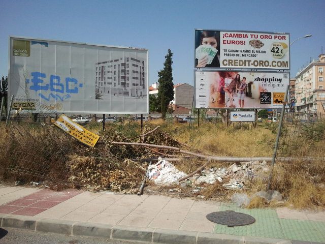 "Hay dos solares cuyas vallas están rotas y en el suelo, y dentro se acumula basura, mientras que otro, cercano a las vías del tren, se ha convertido en un matorral y la maleza cubre ya la acera, impidiendo su uso".
