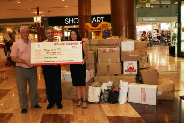 Los clientes de Nueva Condomina han mostrado este verano su cara más solidaria. La iniciativa del centro comercial de colocar un armario en la plaza central para que quien quisiera pudiera donar ropa para Cáritas ha sido un éxito. Desde el primer día han sido muchos los que se han acercado a colaborar y se han recogido más de 2.000 prendas. Además, el centro comercial ha entregado un cheque de 500 euros para la ONG.