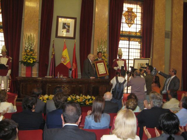 El Alcalde de Murcia, Miguel Ángel Cámara, ha hecho entrega durante la ceremonia del Pregón de Feria 2012 del título de Hijo Adoptivo de la Ciudad de Murcia al eminente profesor Gonzalo Sobejano Esteve, quien ha recordado en su intervención la estrecha vinculación que tiene con Murcia, su lugar de nacimiento.