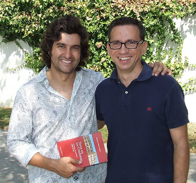Morante, que actúa esta tarde en la plaza de toros de Murcia, ha posado junto a un ejemplar del libro y su autor.