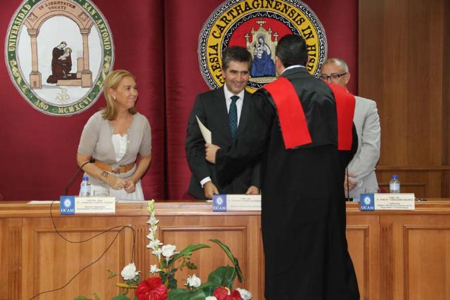 El salón de actos de la Universidad Católica San Antonio de Murcia ha sido escenario esta tarde de la emotiva ceremonia de entrega de Becas y Diplomas acreditativos a los alumnos de la II Promoción del Máster Oficial en Ciencias de la Seguridad y la Criminología de la UCAM. La rectora magnífica de la UCAM, Josefina García lozano, ha presidido el acto acompañada del director del Máster, Francisco de la Torre, el codirector del Posgrado, José María Caballero, y por el director General de la policía, Ignacio Cosidó.