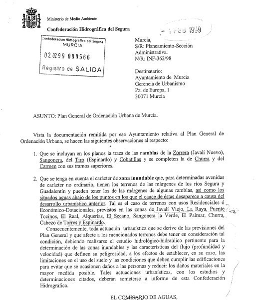 La construcción de urbanizaciones en la zona centro y sur de Espinardo sin el estudio hidrológico previo, tal y como ordena el Plan General Urbano de Murcia, y sin la construcción del interceptor de pluviales previsto, es una temeridad de la que deben responder los políticos que las autorizaron.