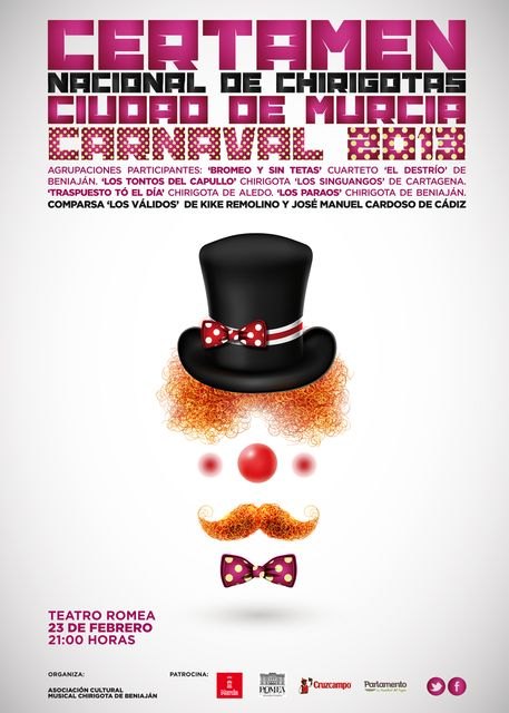 La Asociación Cultural Musical "Chirigota de Beniaján", en colaboración con el Excelentísimo Ayuntamiento de Murcia y el Teatro Romea y con el patrocinio de Cruzcampo y el Parlamento La Catedral del Tapeo, organiza el Certamen Nacional de Chirigotas "Ciudad de Murcia", que tendrá lugar el próximo 23 de febrero, sábado, en el Teatro Romea de la capital.