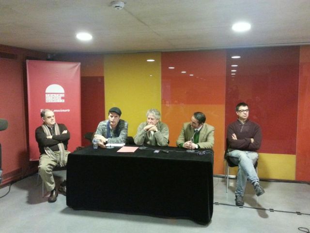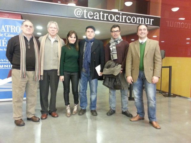 El concejal de Cultura, Rafael Gómez, y el director de Teatro Circo Murcia, César Oliva, han recibido esta mañana en el teatro a ambos actores y al director de la Compañía de Teatro Ferroviaria, Paco Macías, para dar a conocer la gira de la obra que arranca este fin de semana en Madrid.