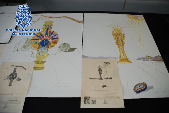 Agentes de la Policía Nacional han recuperado once litografías falsas, atribuidas a Salvador Dalí, y que se encontraban a la venta en varias páginas de Internet. La operación se inició a raíz de la intervención en octubre del pasado año de varias litografías falsas que también se estaban ofreciendo en Internet y que fueron recuperadas en el marco de la operación "Dalí Murcia". Con los datos obtenidos en aquel momento los investigadores de la Brigada Provincial de Policía Judicial de Murcia continuaron practicando gestiones que llevaron a la localización de estas obras falsificadas, que se ofrecían a un precio de 1.600 euros cada una, y que fueron intervenidas en varios lugares de la provincia de Barcelona y en colaboración con los expertos del Grupo de Patrimonio Histórico del Cuerpo Nacional de Policía en la Ciudad Condal.