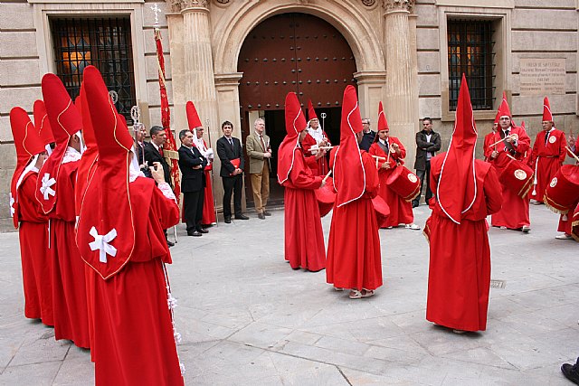 El presidente de la Comunidad Autónoma, Ramón Luis Valcárcel, y el consejero de Cultura y Turismo, Pedro Alberto Cruz, recibieron esta mañana a las puertas del Palacio de San Esteban a la convocatoria de la Archicofradía de la Sangre, que realizó su tradicional recorrido por la ciudad anunciando la popular procesión de 'los coloraos'.