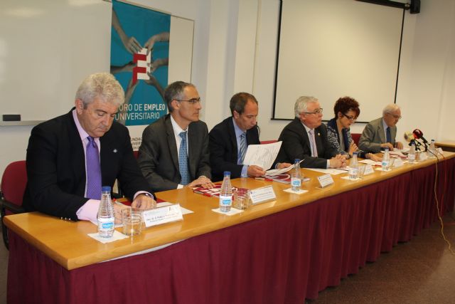 A la rueda de prensa celebrada para dar a conocer las novedades del Foro de Empleo Universitario han asistido Ginés Antonio Martínez, director general del Servicio Regional de Empleo y Formación de la Región; José Antonio Cobacho, rector de la Universidad de Murcia; María Ángeles Esteban, vicerrectora de Coordinación y Comunicación; Fernando José Vélez, director general de Trabajo. Delegación del consejero de Educación, Formación y Empleo; Pedro Juan Martín, vicedecano de Calidad de la Facultad Economía y Empresa, y el citado Enrique Egea.