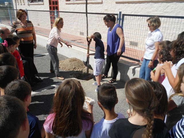 La concejal de Medio Ambiente, Adela Martínez-Cachá, y de Educación, Lola Sánchez, ha asistido esta mañana a las plantaciones de nuevos árboles de los alumnos del CEIP Jaun Carlos I de la pedanía de Llano de Brujas.