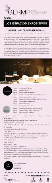La Asociación de Gestores Culturales de la Región de Murcia (GERM) organiza el curso Los espacios expositivos, actividad formativa presencial que cuenta con la colaboración del Ayuntamiento de Murcia, Murcia Área de Cultura y el Centro Puertas de Castilla.