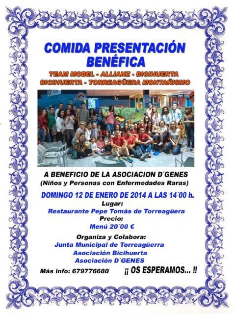 La presentación oficial del equipo tendrá lugar el próximo día domingo 12 de Enero durante una comida, donde además se llevará a cabo una rifa solidaria cuyos beneficios irán destinados a los fines de D'Genes. El lugar de celebración será el Restaurante Pepe Tomás de Torreagüera. Para más información, llamar al número 679 77 66 80.