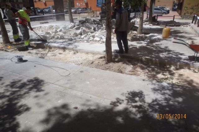 La actuación se prolongará un par de semanas y consistirá en la reposición de los paños de hormigón que se han deformado por la fuerza ejercida por las raíces. Actualmente se está procediendo a la demolición de los paños. Igualmente, se elevará la cota del pavimento para que no se vuelva a producir dicha deformación.