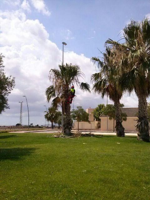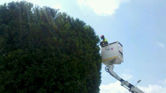 Esta mañana también se ha realizado la poda en altura en el jardín del Álamo; el recorte de árboles y arbustos en los jardines de La Granja, en El Palmar; la poda de palmeras en el jardín junto al colegio de Lobosillo; y el recorte de ficus en Monteagudo y de setos en el jardín Los Casones de Javalí Viejo.