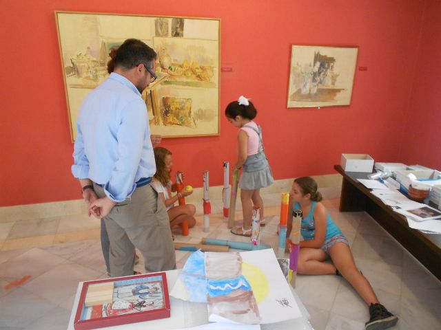 El concejal de Cultura, Rafael Gómez, ha visitado esta mañana el Museo Ramón Gaya de Murcia para ver in situ el trabajo que han realizado los pequeños participantes en uno de los talleres organizados por el Museo dentro del programa “Un verano de Museo”. Gómez ha aprovechado la visita para hacerles entrega de los diplomas que acreditan la realización del taller.