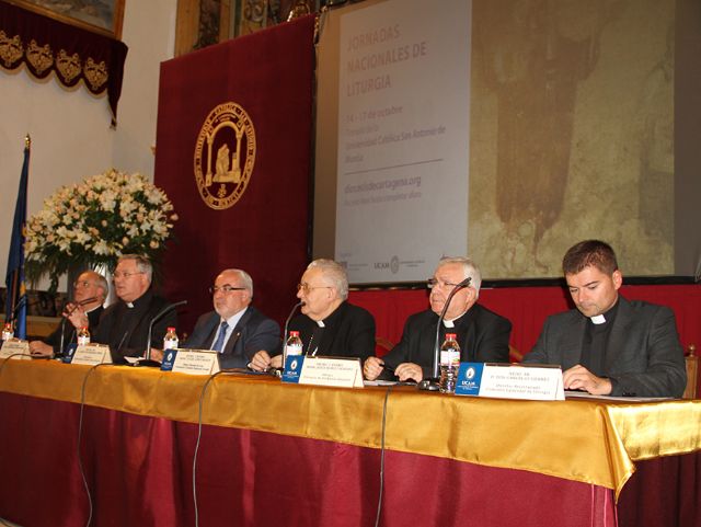El Templo del Monasterio de los Jerónimos, sede de la Universidad Católica de Murcia, ha acogido esta tarde la inauguración de las Jornadas Nacionales de Liturgia 2014, organizadas por la Conferencia Episcopal Española a través de la Comisión Episcopal de Liturgia. La jornada, que en esta ocasión se celebra bajo el lema 'La belleza evangelizadora de la liturgia', se desarrollará en el Campus de la UCAM hasta el próximo viernes. En el acto de apertura, que ha comenzado con una oración, han intervenido el presidente de la Universidad, José Luis Mendoza; el obispo de la Diócesis de Cartagena, José Manuel Lorca Planes; el obispo de León y presidente de la Comisión Episcopal de Liturgia, monseñor Julián López; los obispos de las diócesis de Orense, José L. Lemos; y de Orihuela-Alicante, Jesús Murgui; y el director del Secretariado de la Comisión Episcopal de Liturgia, Luis García.