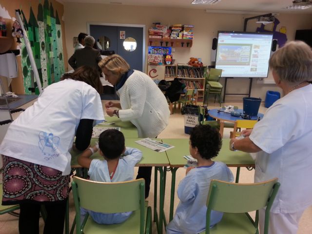 La concejal de Medio Ambiente, Adela Martínez-Cachá, ha visitado esta mañana la actividad que se desarrolla, a través de la Ecoaula de Educación Ambiente, en el aula hospitalaria de la Arrixaca.