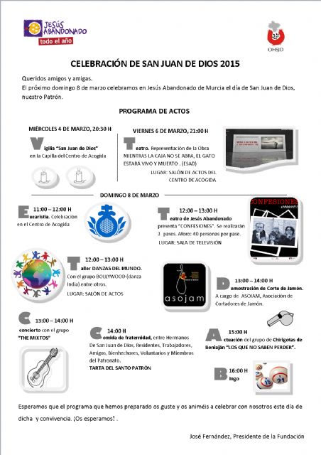 Residentes, trabajadores, colaboradores, voluntarios, amigos todos están invitados a disfrutar de este día de puertas abiertas. Empezaremos a las 11h con una eucaristía, tras la que darán comienzo todas las actividades programadas: teatro, música en directo, degustación de jamón, taller de danzas del mundo… son algunas de las actividades que compañeros, voluntarios y colaboradores han preparado para amenizar la jornada hasta la hora de la comida (14h). Tras la misma, actuará el Grupo de Chirigotas de Beniaján "Los que no saben perder".
