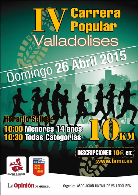 Tras la IV Media Maratón Nocturna y III 10kms. “Ciudad de Águilas”, Memorial Juan Palazón que como ya se dijo albergará además el Campeonato de la Región de Murcia de Media Maratón el próximo sábado 11 de abril, dicho mes aún nos brindará una nueva cita con el circuito de carreras populares Región de Murcia Running Challenge. Será el domingo 26 cuando tenga lugar la 6ª prueba del calendario, enmarcada en la IV Carrera Popular de Valladolises. La pedanía murciana acogerá una cita que arrancará a las 10:00h. con las pruebas de menores, estando previsto el inicio de la prueba absoluta a las 10:30h. sobre un recorrido mixto -tierra y asfalto- de aproximadamente 10km. con salida y meta en el Centro Cultural.