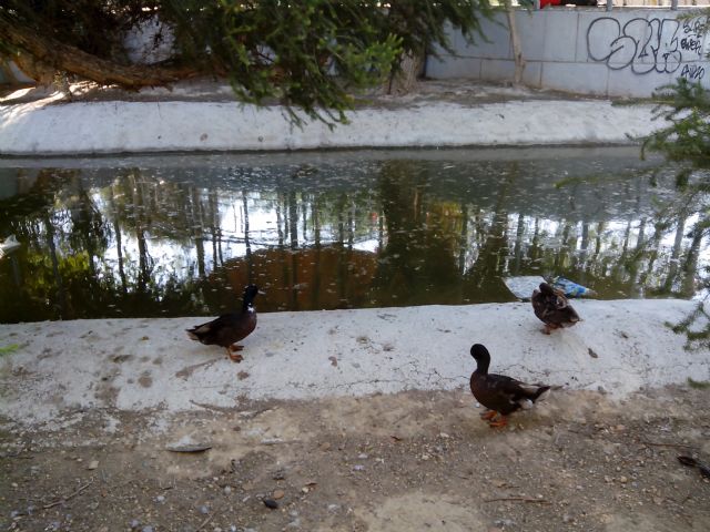 AHORA MURCIA denuncia el estado en que se encuentra el estanque del Parque de Fofó, con un color del agua y un olor nauseabundos, además de acumular gran cantidad de bolsas y botellas, entre otra basura. La situación del estanque es tan insalubre que los patos prefieren estar sobre el hormigón de la orilla antes que nadar o refrescarse en las aguas.