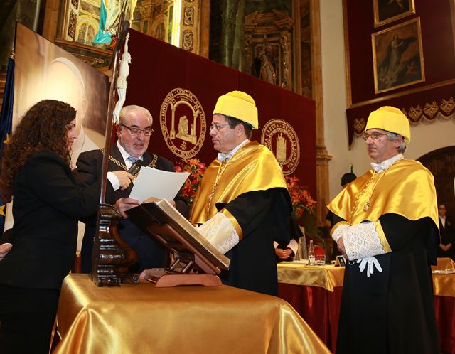El Templo del Monasterio de Los Jerónimos, sede central de la Universidad Católica de Murcia, ha sido el escenario de la investidura de Fabio Pigozzi, presidente de la Federación Internacional de Medicina del Deporte y rector de la Universidad 'Foro Itálico' de Roma, como Doctor Honoris Causa. El acto ha estado presidido por José Luis Mendoza, presidente de la UCAM, acompañado por Josefina García, rectora de la Universidad; Antonio Montoro, rector Honorario, y Pedro Manonelles, director de la Cátedra Internacional de Medicina del Deporte, quien ha presentado al nuevo Doctor Honoris Causa. Entre los argumentos que ha expuesto para el nombramiento de Pigozzi ha destacado su amplia trayectoria y su prestigio como profesional, docente e investigador y su prioridad absoluta en favor de la persona más allá de los resultados del deportista.
